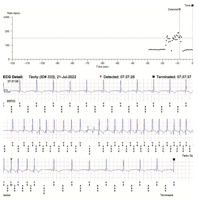 In May 2019, a 70-year-old woman presented with a history of recurrent palpitations and 3 episodes of syncope following exercise at the gym. Her past medical history was remarkable for breast cancer treated with mastectomy 13 years prior without complications, except for a self-limiting rash around the surgical site following the procedure. The patient was referred by neurology following a normal brain magnetic resonance imaging without contrast, brain magnetic resonance angiography, and electroencephalogram. Following the referral, the patient underwent an electrophysiology study (EPS) and subsequent ILR implantation due to the frequency of her palpitations and syncopal episodes. EPS results were unremarkable; there was no evidence of a jump or extra pathway, and no supraventricular or ventricular arrhythmias were induced. During the 4 years of remote ILR monitoring, the patient exhibited recurrent episodes of nonsustained supraventricular tachycardia (SVT) (Figure 1). These episodes were mildly symptomatic and associated with her palpitations. To address these episodes, the patient began taking 25 mg of metoprolol succinate extended-release once daily. In April 2023, the patient underwent the removal and replacement of her ILR. Prior to the procedure, she informed her EP team that she had a previous “Steri-Strip allergy.”