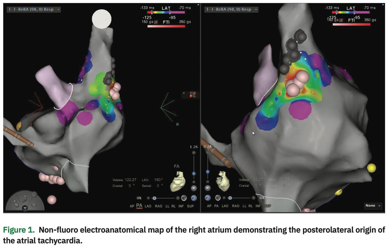 To move forward, we decided to first do a DC cardioversion with amiodarone support to assess whether symptomatic relief would be experienced. Indeed, the patient felt much better after 2 weeks. Thus, she wanted to plan the rhythm control strategy as soon as possible. After complete workup, we performed the surgical ablation procedure. This was composed of complete posterior box isolation including bilateral pulmonary vein isolation with a bipolar ablation device. Finally, the left atrial appendage was resected with a stapler device. At the end of the procedure, we documented bidirectional pulmonary vein isolation with epicardial measurements (Cardioblate MAPS Device, Medtronic) as well as complete isolation of the posterior left atrium. The procedure lasted 70 minutes, and the patient went home on day 4. After 4 weeks, a sudden onset of an atypical atrial flutter was treated by DC cardioversion. When this returned after 2 more weeks, the patient wanted to undergo the second step of the procedure. During this procedure, complete isolation of the pulmonary veins was demonstrated. An atrial tachycardia (AT)originating from the superior posterolateral aspect of the right atrium was induced, precisely mapped using CARTO (Biosense Webster, Inc., a Johnson & Johnson company), and successfully ablated.