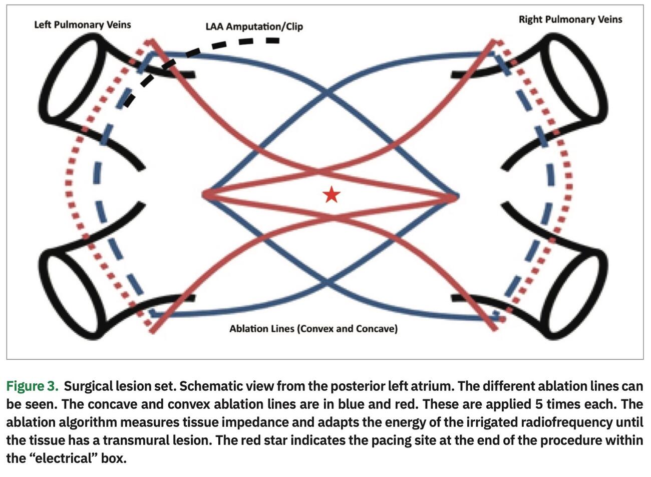 A surgery-first strategy is often limited to cases of long-standing persistent AF. Strictly oriented to anatomical structures, the surgeon attempts to isolate the posterior left atrium, including the pulmonary veins, and performs LAA occlusion to eliminate the need for anticoagulation after the procedure. In the few cases in which a cardiac arrhythmia recurs after rhythm surgery, the electrophysiologist will utilize 3D mapping and ablation to reassess the situation and, if necessary, “re-treat” (in rare cases of PV/box reconnection) or eliminate the arrhythmia (extrapulmonary triggers).