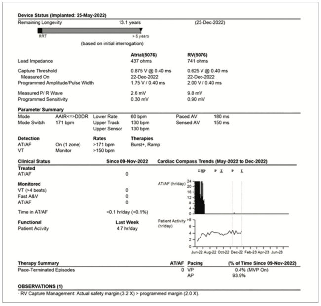 Following the ablation, the patient has remained without recurrence, as documented on his most recent device interrogation in December 2022 (Figure). He was on AAD therapy with amiodarone, which was discontinued 4 months postablation at a follow-up office visit due to no recurrence. If the patient experiences notable recurrent AF, repeat ablation vs AAD will be considered. Thus far, the results of this case have supported the results of the CONVERGE trial with significant reduction in AF burden. The patient will be monitored for recurrence of AF with device interrogations every 3 months, and is scheduled for follow-up at 1-year postablation.