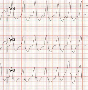 Upon arrival, he was found to be in a wide complex tachycardia at 180 beats per minute (bpm), with electrocardiographic confirmation of monomorphic ventricular tachycardia (VT) (Figure 1). His S-ICD was programmed to recognize ventricular arrhythmias at or above 200 bpm due to prior inappropriate shock therapy for atrial arrhythmias, and the patient sustained this rhythm until subsequent chemical conversion with an amiodarone bolus. Upon restoration of sinus rhythm, the patient was free of chest pain and asymptomatic. His blood chemistries were unremarkable. High-sensitivity troponin peaked at 733 ng/L (normal <59 ng/L).