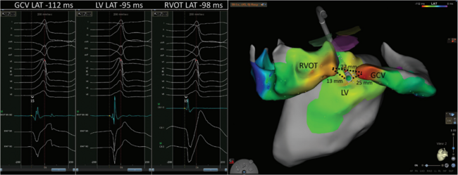 Annotating PVC LAT to the first rapid deflection of the bipolar electrogram can generate activation maps that facilitate effective catheter ablation. Successful ablation sites using this method of annotation have been previously described to have a median (interquartile range) pre-QRS time of 20.5 ms (17.8-26.0 ms) and 14 ms (11.2-22.6 ms) for immediate and delayed suppression, respectively. Failure was reported with a median (interquartile range) pre-QRS time of -3.5 ms (-9.2, 1.5 ms).2 For deep intramural foci often found with LVS PVCs, mapping ventricular signals from adjacent anatomic structures can facilitate triangulation of origin and allow for successful ablation from sites on the endocardium where local electrograms are not early relative to the onset of the QRS complex. This so-called anatomic approach has garnered more support in recent years. Longer lesions (2-3 minutes) and targeting sources <13 mm away from the endocardium have been associated with successful ablation.3,4