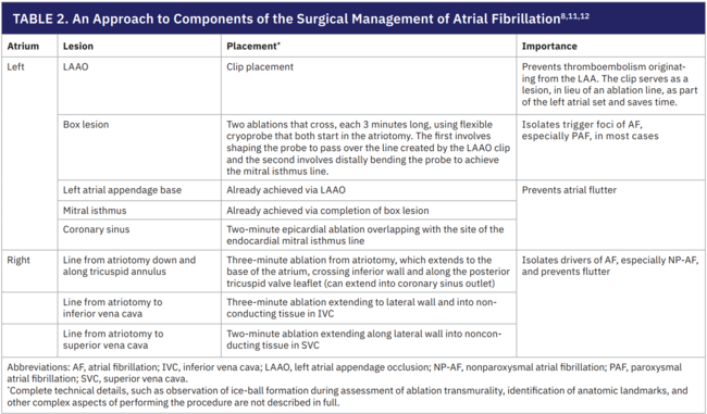 - Tailoring the lesion set to the patient. Each lesion in the SA procedure should have a clear purpose (Table 2) and its benefit must outweigh the cost of added bypass time or permanent pacemaker (PPM) risk.8,12 In practice, lesion sets can be adjusted based on patient factors to balance efficacy and safety.