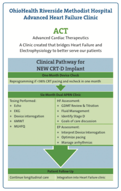 The ACT Clinic at Riverside Methodist Hospital was developed to provide standardized follow-up for patients after CRT implant, using a multidisciplinary APP model. Currently, there are no published guidelines available for post-CRT management. Using a standard care pathway, patients who undergo CRT device implant have consistent follow-up, ample opportunity for education, and may potentially improve response to CRT therapy. The collaboration between EP and HF services in this clinic serves to recognize patients who are at risk of further deterioration and offer ongoing arrhythmia management as well as assist in identifying candidates who may benefit from advanced HF therapies.