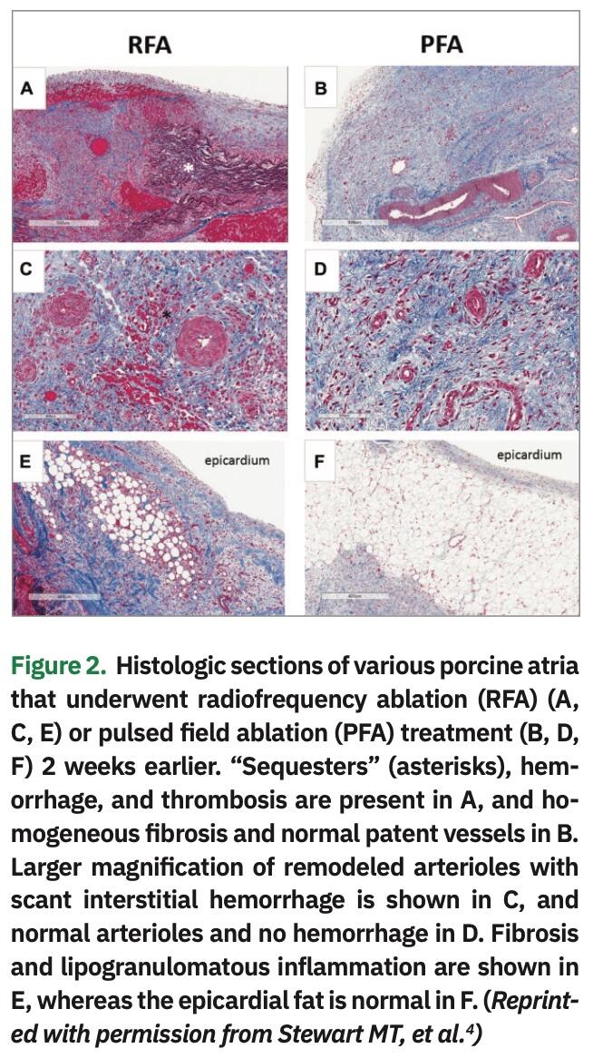 PFA lesions are characterized by homogeneity compared to radiofrequency ablation (RFA) lesions, which show inhomogeneity with many islands of sequestered viable myocytes. Compared to RFA, PFA deliveries do not cause epicardial fat tissue inflammation in the treated area or noteworthy arteriolar remodeling (Figure 2).4 IRE lesions show homogenous organized fibrotic replacement of the myocytes without the inflammatory signatures that accompany other ablation modalities. IRE is associated with extracellular matrix preservation,5 unlike RFA, which shows significant denaturation of collagen.6 One can speculate that an unperturbed extracellular matrix could possibly lead to lower left atrial (LA) stiffness and lower risk of stiff LA syndrome, as is seen after some cases of extensive RFA.6 However, this needs to be investigated. Early reports show transient impact on the conduction system with recovery. This property, in conjunction with reversible electroporation, could lend additional utility as a modality for mapping prior to ablation of the target area, akin to cryomapping.7 Most of the PFA research has focused on ablation of the atrial substrate in experimental animals with normal hearts. Understanding the electric field behavior across scar tissue will be of value, especially as we extend applications into the persistent AF substrate and ventricular arrhythmias.