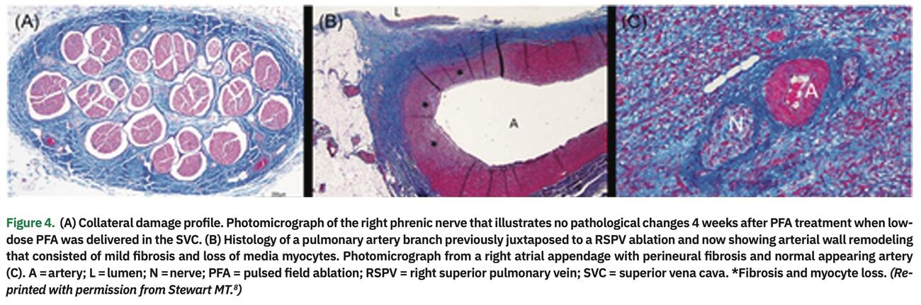 The unique promise of PFA lies in cardiac tissue selectivity, and several studies have confirmed this observation. While this mechanism is not well understood, striated muscle is thought to have lower threshold for IRE (400v/cm).8 There has been no evidence of epicardial adipose inflammation, vascular thrombus, phrenic nerve injury, or evidence of Wallerian degeneration/perineural fibrosis noted with PFA application (Figure 4). Interestingly, in a swine study, there was evidence of mild neointimal remodeling and non-myelinated autonomic nerve injury. The latter could be of benefit in ablating the autonomic plexi postulated to play a role in AF initiation and maintenance.8 The Varipulse directional circular lasso catheter (Biosense Webster, Inc., a Johnson & Johnson company) is coupled to an IRE ablation system using bipolar monophasic ablation with a relatively long pulse duration (250 ms). This was tested in swine, and 11/12 achieved pulmonary vein entrance block with a lesion width up to 14 mm. Chronic lesion stability was observed in this 30-day survival study. There was no evidence of phrenic or esophageal damage despite ablation overlaying these organs.9 The Pulmonary Vein Ablation Catheter (PVAC GOLD, Medtronic) was similarly tested in 8 swine and compared to RF. There was no evidence of pulmonary, esophageal, or vagal injury with PFA.10