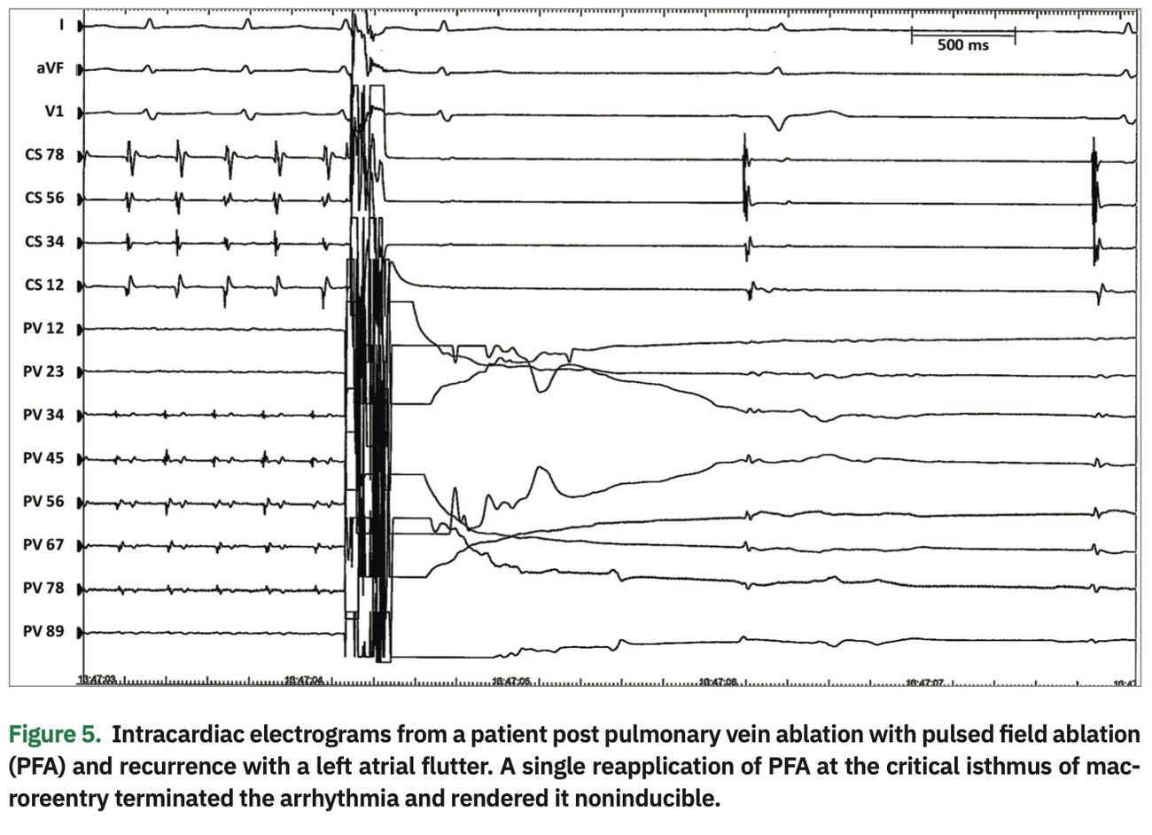 The IMPULSE and PEFCAT trials analyzed the outcomes of PFA in the symptomatic paroxysmal AF population with left ventricular ejection fraction of >40% and LA dimension <5 cm.11 This was an interesting study in which the sponsor iterated and optimized the ablation system using patients as the test subjects. Monophasic and biphasic waveforms from 900-2000V were optimized during the course of the trial. The success with remapping increased from 18 to 100% with successive waveform refinements. Echoing prior clinical reports, our experience suggests effective termination of atrial fibrillation and flutter with PFA delivery. (Figure 1 and 5)