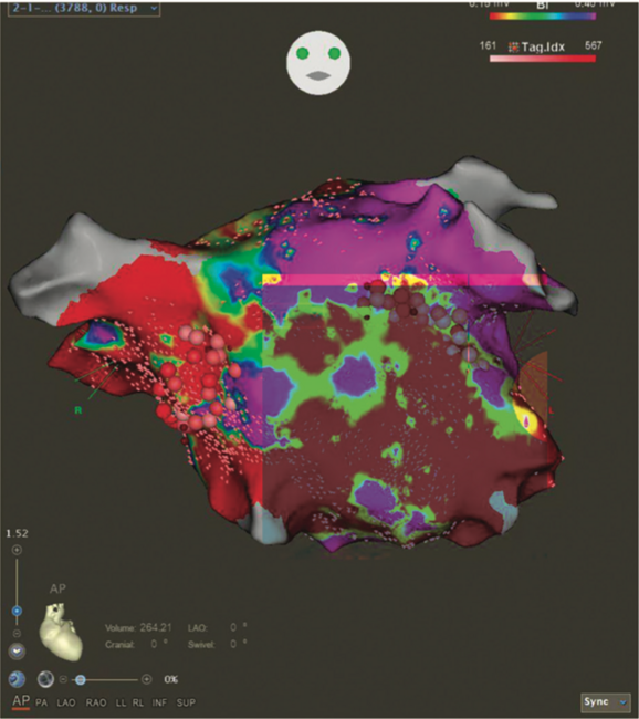 Atrial fibrillation recurred and the patient underwent cardioversion in February 2019. Atrial fibrillation recurred early after cardioversion and a second ablation was performed in March 2019. All 4 pulmonary veins were confirmed to be isolated. The FIRMap and RhythmView Workstation were again used to locate and ablate 2 rotors in the right atrium at the posterior septum and anterolateral free wall. One rotor was ablated between the left atrial appendage and the mitral valve annulus. An atrial tachycardia involving the left superior and inferior veins was treated with ablation anterior to the left pulmonary veins. A posterior wall ablation line was created between the left and right superior pulmonary veins.