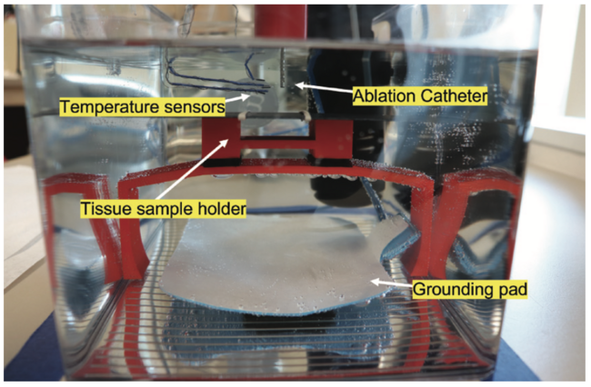 The EPCRI lab has developed a modular ex vivo testing setup for iteratively developing and testing catheters as well as studying the underlying biophysics of ablation (Figure 1). The team used this ex vivo test setup to better understand the effects of atrial ablation on esophageal lesion formations, specifically, the changes in luminal and esophageal surface temperature during standard power (10/20/30 W) and high power, short duration (HPSD) (40/45/50 W) ablation. We used fresh porcine hearts and esophageal sections. The study showed that after ablation, the esophageal luminal temperature peaked after a certain delay (HSPD 24.2 ± 22.1 sec vs Standard 13.0 ± 11.0 sec; P=.023). The rise in epiesophageal and endoluminal temperature was greater in HPSD compared to standard ablation (epiesophageal 5.9 ± 5.6 vs 2.2 ± 2.0°C; P<.01; endoluminal 0.7 ± 0.5 vs 0.4 ± 0.2°C; P<.01). Furthermore, the study found that endoluminal temperature readings significantly underestimate the temperature on the surface of the esophagus during HPSD.11