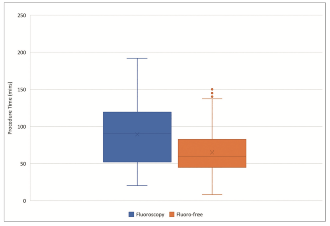 Use of 3-dimensional (3D) mapping has allowed us to visualize ablation lesions, identify areas of poor lesion formation, review lesion locations and impedance changes, and perform rudimentary timing/voltage maps if required, all of which has reduced our RF and procedure times. Compared to procedures using fluoroscopy, the average procedure and radiofrequency (RF) times for fluoroless procedures were lower, with 65.8 minutes (without fluoroscopy) compared to 87.7 minutes (with fluoroscopy) for procedure time (Figure 1), and 12 minutes, 56 seconds (without fluoroscopy) and 18 minutes, 28 seconds (with fluoroscopy) for RF times (Figure 2).