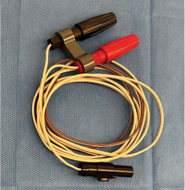 Prior to draping the surgical field, the sterile cardiac surgery epicardial pacing connector cables (Figure 1) are prepared as in-line extensions for the V1 electrode. This is easily done on the sterile table. The scrub technician separates the distal connector (Figure 2) and divides the 2 cables into 2 separate pieces (Figure 3), and one cable is passed off the sterile field. A short (approximately 2-cm) section of the conductors of this cable is exposed (Figure 4) and inserted into the V1 clip of the ECG machine (Figure 5). For conductor exposure, a traditional electrician’s wire stripping device is used, but alternatively, scissors as well as scalpel blades can be carefully utilized.