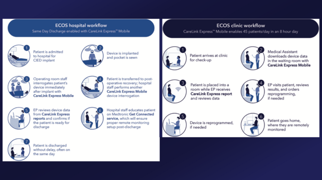Streamlined discharge: The peri-operative workflow is designed with the goal of mitigating delays to patient discharge, often leading to discharge on the same day as the implant when clinically appropriate. Streamlined discharge is enabled through use of a tablet-based device interrogator, the CareLink Express Mobile (CLEM) system (Medtronic), which is used by operating room staff to interrogate the device after the pocket is sewn and transmit initial device readings to the CareLink network. Following transfer of the patient to post-operative recovery, hospital staff conduct another CLEM-enabled interrogation and subsequent CareLink data transfer. The implanting physician is then able to review the device data in the CareLink network and confirm that the patient is ready for discharge—either on the day of implant or the following morning—without having to wait for a programmer evaluation.