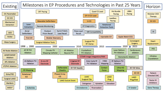 The figure below is an attempt to display a timeline over the past 25 years that includes major milestones in the field of EP. While not exhaustive, it attempts to highlight events that had a major impact on practice. It also includes a few failures. In the left column are most of the procedures that existed before 1998 and in the right column are those that are likely on the horizon. The left-hand side of each text box is approximately aligned with the date of initial US Food and Drug Administration approval of the technology. Many of the technologies were already available in Europe and existed as part of clinical trials in the US. Failures are denoted with horizontal lines through the text box.