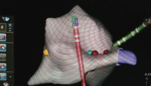 Access to the left atrium (LA) was gained via transseptal puncture and mapped (Figure 2) using the CARTO system (Biosense Webster, Inc., a Johnson & Johnson company). Initial EP testing revealed left lateral atrioventricular signal consistent with an accessory pathway near the distal CS lead 1-2 in the lateral LA, but was later seen medially at 3-4 and 5-6 (Figure 3). Extensive ablation of this pathway demonstrated separation of atrial (A) and ventricular (V) signals at CS 1-2 with corresponding change in QRS morphology (Figure 3); however, there was no resolution in delta wave. Persistent AV signal fusion and pre-excitation was seen at multiple points in the left atrium, including posterior septal throughout the left lateral position. Subsequently, the RA was reentered and mapped (Figure 4), and an AV signal fusion was noted near the os of the CS. After a brief ablation of this area, there was a separation of the VA on CS 7/8 as well as a corresponding change in QRS, this time with resolution of pre-excitation (Figure 4).