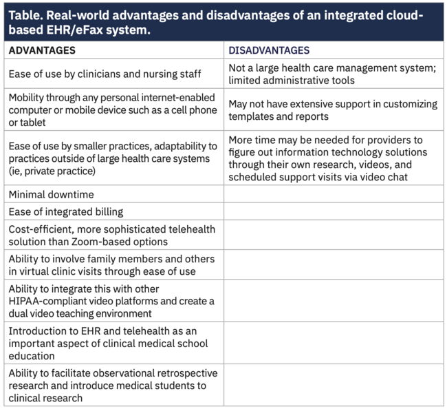 Additionally, the cloud-based EHR system has helped facilitate research. The system can create reports based on patient demographics and diagnoses. Retrospective, de-identified observational research by LIHRC has been deemed exempt by the New York Institute of Technology College of Osteopathic Medicine (NYITCOM) Institutional Review Board. This has permitted Dr Cohen and the medical students at NYITCOM to complete a myriad of observational clinical and research studies, resulting in at least 50 presentations/publications using the EP VMO. In addition, the EP VMO has served as a useful tool for medical education as well as introducing students to telehealth and research. The system has been cost-effective and has very little downtime.