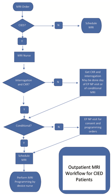 When scheduling an MRI, if a patient indicates that they have a pacemaker or ICD, their request will be sent for screening. The screening of all CIEDs for MRI compatibility is managed by MRI nurses who have been trained in a basic understanding of CIED programming and what constitutes a conditional vs nonconditional CIED. Patients with conditional devices will proceed to scheduling (if they have met the same chest x-ray and interrogation criteria required of nonconditional patients). Those patients who have nonconditional systems will be referred to an EP NP for consent and programming orders. If necessary, this can be done via phone or video (Figure 1).