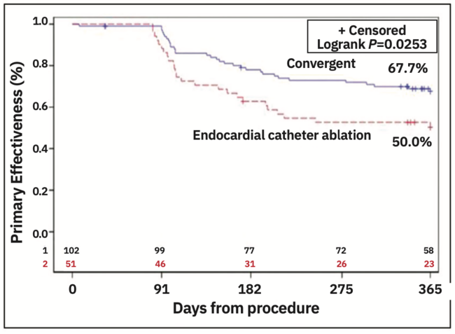 The CONVERGE IDE trial results were a major step forward for the treatment of nonparoxysmal atrial fibrillation (AF).1 Despite the promising results of this trial showing a significant improvement in rhythm control for patients treated with a hybrid team ablation approach when compared to stand-alone endocardial catheter ablation (Figure 1), it begs the question: can we do better? Is a 67% freedom from AF without the use of new antiarrhythmic drugs the ceiling for a hybrid team approach? If the on-pump Cox-Maze surgery can consistently achieve rhythm control in >80% of patients over the mid and long term,2,3 can we modify the original trial Convergent procedure to more closely approach the Cox-Maze surgery, and in doing so, achieve better patient outcomes? We believe we can. Herein we share an evolved iteration of the Convergent procedure, also known as Convergent “Plus.”