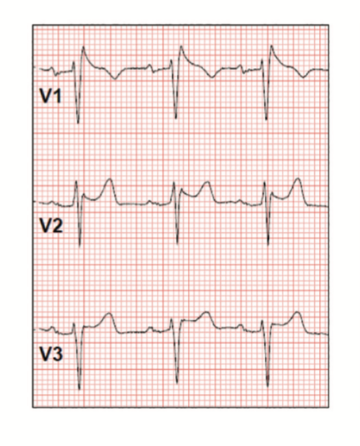 BrS is a familial arrhythmia syndrome with complex inheritance, which manifests as a coved ST-segment elevation pattern in precordial leads V1-V2 along with T wave inversions (type 1 pattern), and in some patients, is associated with ventricular fibrillation (VF). A type 2 BrS ECG pattern is described as a “saddle-back” ST-segment elevation and an upright or biphasic T waves in V1-V2. (Figure 2)