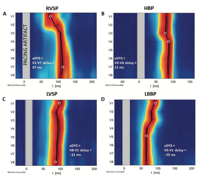Interestingly, a substantial interindividual heterogeneity among patients receiving RVSP was observed. Many had eDYS values below 30 milliseconds (Figure 3A), while others had significant ventricular dyssynchrony during RVSP (Figure 3B).