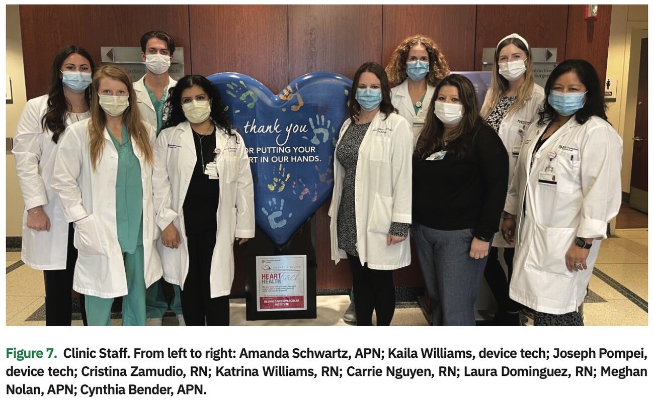 We have 8 full-time EP faculty at Northwestern Memorial (NM) and 4 EP fellows. We also have an advanced practice nurse (APN) who independently performs cardioversions and places implantable loop recorders (ILRs), as well as an APN who manages cardiac implantable electronic devices (CIEDs) for patients undergoing MRIs and helps run the inpatient EP consult service. Our outpatient EP team consists of 4 EP nurses and 3 EP APNs, and a fully staffed device clinic.