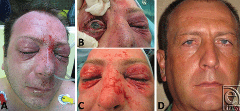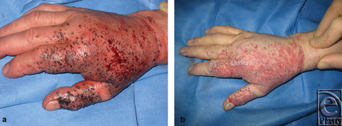 In all cases, we used a standard hand-piece Versajet Plus, with a 45°-angled tip and a 14-mm working window. The operation was closed by the uptake of a dressing (Omiderm). The wounds healed in all cases with no complications at 2 weeks; 6 months postoperatively no significant scar formations are visible. To describe our method analytically, we would like to refer to the case of a 39-year-old male patient who had an industrial accident while welding. The explosion caused a blast injury with facial traumatic inclusion of foreign bodies. The patient was admitted 30 minutes following injury. During admission on our burn unit, physical examination revealed an irregular pattern of deeply embedded fine and rough particles 1 to 4 mm in diameter that affected the nose, cheeks, forehead, and both eyelids (Figs 1a and 1b). An injury of the medial corner of the left eye was treated surgically, whereas the Versajet hydrosurgery system was sufficiently used for wound debridement and foreign body extirpation under general anesthesia (Fig 1c). For the surgical procedure, we used a standard hand-piece with a 45°-angled tip and a 14-mm working window. Conjunctivas and lenses of both sides were cleaned under the operation microscope. The operation was closed by the uptake of a dressing (Omiderm, Omikron Scientific Limited, Rehovot, Israel). We would like also to present the case of a 24-year-old patient who underwent a blast injury by an explosion of firework with foreign bodies incorporation in his right hand (Fig 2a). The use of the Versajet system allowed for a successful removal of foreign body particles with good functional and esthetic result (Fig 2b).
