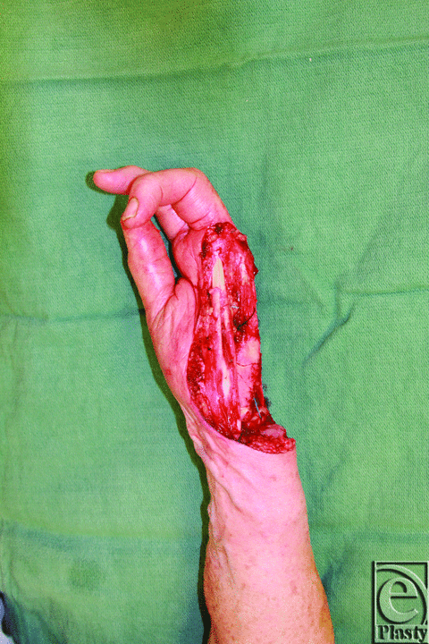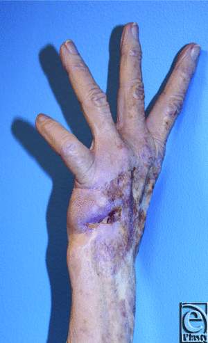 A 76-year-old right-hand dominant Caucasian woman with a history of recurrent cutaneous squamous cell carcinoma of the left hand was initially diagnosed in 2002. Prior treatment included multiple Mohs' procedures of her left hand. The patient did well until she began to experience weakness, recurrent abduction of the fifth finger, and serous drainage from the dorsum of her hand. Radiographs demonstrated osseous involvement, and the patient was referred to the MD Anderson Cancer Center in Houston, Texas, for definitive management (Fig 1).