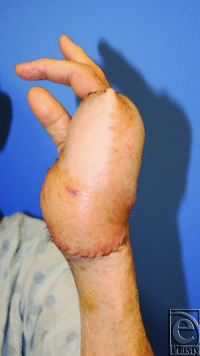 We present a case of a 76-year-old Caucasian woman with a recurrent cutaneous squamous cell carcinoma. Local flap coverage was not an option because of the extensive prior resections. Free flap coverage with a contralateral forearm-based flap was refused by the patient because of concern for morbidity to her dominant arm. A major reconstructive challenge of this case was the interruption of the superficial vascular arch following amputation of the ring and little fingers. Although retrograde flow was noted in the distal stump of the transected superficial arch, long-term maintenance of this vascularity was unknown. Loss of this retrograde flow into the residual ulnar artery could have led to loss of the patients remaining left hand. We believe that the case presented is truly unique as a large, composite defect with an obliterated palmer arch was created in an elderly, active patient and this anatomy was reconstructed in a 1-stage procedure with excellent long-term results.