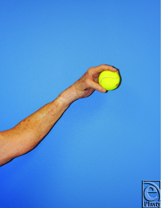 At 2 weeks postoperative follow-up, the patient showed excellent healing of all surgical wounds without complications (Fig 6). The patient was recovering motion of her thumb and index and middle fingers with the assistance of physical and occupational therapy.