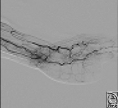 | Figure 9. Postoperative angiogram at 6 months, which demonstrates a patent reconstructed superficial palmer arch of the left hand with patency of the flow-through anterolateral thigh flap vessel. |