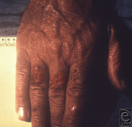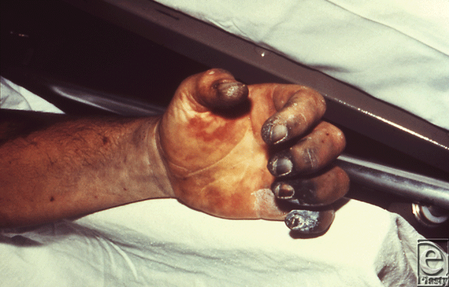 | Figure 3. This patient presented with symptoms of plague that included gangrene of the right hand causing necrosis of the fingers. Source: Public Health Images Library (PHIL) id# 4137. |