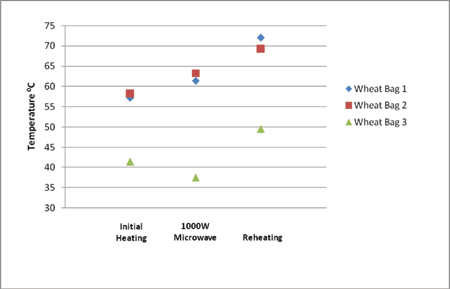 The experiment was performed in 3 parts using 3 wheat bags of different size and brand. The temperature of each bag was measured 3 times and averaged before heating to establish a starting temperature. This was performed 3 times to establish a mean overall starting temperature.