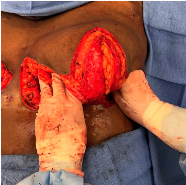 The batwing was first deepithelialized. The remainder of the Wise-pattern markings were incised, and electrocautery was used to dissect the underlying muscle fascia. The medial and lateral edges of the batwing were cut using electrocautery. An approximately 1- to 2-cm dissection was made, marking the thickness of the batwing flap. The IMF incision, carried down to muscle fascia, was continued in this plane superiorly toward the clavicle. The batwing flap was cut superiorly toward the clavicle and once the 2 dissections met, the HS affected breast tissue was excised; the right and left tissue weighed 947 g and 546 g, respectively (Figure 3B and C). To allow for inset, a full-thickness incision was made down the middle of the flap to create 2 halves (Figure 1B). Each half was then rotated underneath the breast flap (Video) and inset to the pectoralis fascia superiorly using polydioxanone sutures; this was performed until the contour of the breasts was satisfactory. The breasts were then closed in 3 layers. Iodoform wicks were placed between the sutures to allow for drainage. Blake drains were also placed (Figure 4).