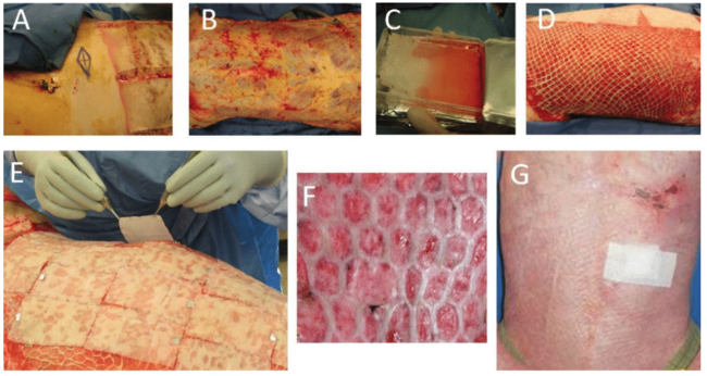 The stability of CEA can be improved by the provision of a dermal bed. One technique involves applying CEA to a mechanically de-epithelialized allogeneic skin transplant, which improves bonding by creating a non-antigenic allodermis for CEA engraftment.14 However, this technique necessitates a 2-stage procedure and may be complicated by the loss of allograft and infection. An alternative method is to place the CEA over widely meshed autograft (Figure 1E). Careful handling is required to reduce the shearing of the delicate grafts, which places a huge burden on the patient and staff.1 They are also best confined to the anterior surfaces of the body. The lower limbs can be grafted circumferentially with the aid of external fixation to elevate them off the bed. Postoperatively the wound should remain undisturbed for 7 to 10 days.