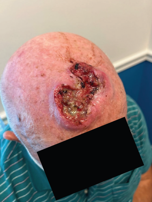 We present an 84-year-old male with advanced squamous cell carcinoma (SCC) of the scalp who had a delayed presentation for treatment (Figure 1). Prior to surgery, the patient received neoadjuvant immunotherapy with a PD-1 inhibitor. The patient’s initial operation included a 12 × 12-cm tumor excision, tangential craniectomy over the superior sagittal sinus and scalp flap based on the left temporal vessels with Integra Bilayer Wound Matrix reconstruction (Integra Life Sciences) of the scalp donor site defect (Figure 2). At the 4-month postoperative follow-up, there were concerns for recurrence of the disease. Computerized tomography scan identified a homogenous collection under the flap and moth-eaten appearance of the underlying cranium (Figure 3). The patient was taken to the operating room and found to have tumor invasion of the scalp flap, underlying bone, and dura as confirmed by frozen pathological specimen. He underwent an additional 8 × 8-cm tumor excision, partial craniectomy, and dural debridement by our neurosurgical colleagues to diminish the tumor burden (Figure 4). Wound closure was achieved by scalp flap readvancement. Negative margins were unattainable, and the patient received adjuvant immunotherapy.