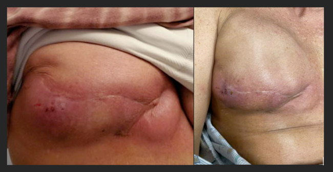 A 44-year-old woman with right skin-sparing mastectomy and axillary lymph node dissection with immediate reconstruction with tissue expander implant placement presented with 2 weeks of increasing erythema along the medial and lateral portions of the incision and a burning sensation (Figure 1). Upon inspection of the surgical site, an area of dehiscence of the lateral portion of the incision was noted with no drainage. The patient had a C-reactive protein (CRP) of 23, no leukocytosis, and an unremarkable ultrasound. The patient was admitted and started on intravenous cefepime and vancomycin.