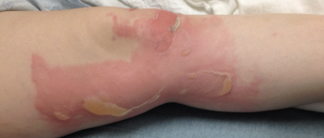 Figure 1. Blisters are found on the anterior and medial aspect of the leg. The burn is tender with good capillary refill. The wound was completely healed within 3 weeks.