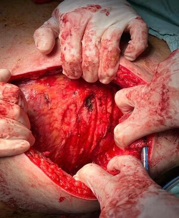 Figure 4. The empty space left after resection of the right-side tumor. Some of the serratus muscle and ribcage can be observed.