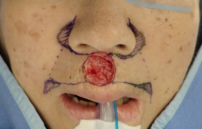 The typical treatment for BCC is a standard resection with postoperative marginal assessment because the metastatic rate of BCC is less than 0.1%.2 For high-risk BCC, a resection margin of 4 to 6 mm is recommended.3 This patient had a morpheaform pattern pathologically and was considered to be high risk. We resected the lesion with a 5-mm margin and performed postoperative marginal assessment before reconstruction.