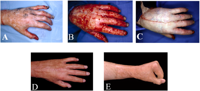 Figure 1. The appearance of the left hand (A) on admission, (B) following excision of burn eschar to viable yellow fat and white reticular dermis. (C) The hand is resurfaced with sheet split-thickness skin grafts. (D) Appearance at 3 months, with full extension of the digits, and (E) with full flexion of the digits.