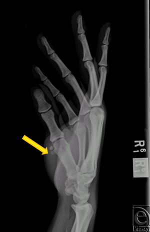 | Figure 1. X-ray. Two 4-mm, radio-opaque masses (arrow) can be visualized alongside the volar and radial aspect of the head of the right first metacarpal bone. No acute fracture is noted. |