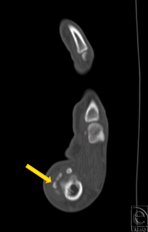 After 24 hours, physical examination revealed moderately decreased erythema and swelling and improvement of thumb ROM. Severe thumb pain persisted. A hand surgery consult was requested, and CT scan of the hand was obtained. Consistent with the initial x-rays, foci of mineralization adjacent to the thumb MP joint were noted (Fig 2). This was again suggestive of synovial chondromatosis. The thumb was placed in a spica splint and the patient was seen in hand clinic the following week. After 1 week of immobilization, swelling of the thumb had subsided but pain and tenderness at the first MP joint persisted. Total active motion of the thumb was 36°. Surgical excision of the masses identified by radiography was subsequently recommended.