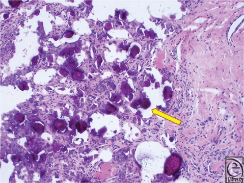 | Figure 4. H & E staining of excised masses. The purple granules (arrows) were determined to be result of tumoral calcium phosphate deposition disease (calcinosis). |