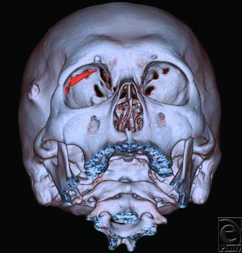 | Figure 1. CT indicating calcifications in the upper part and outer side of the right orbit. The elongated objects depicted in red are the foreign bodies. |