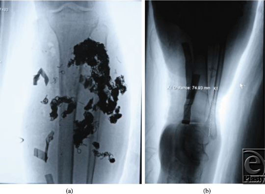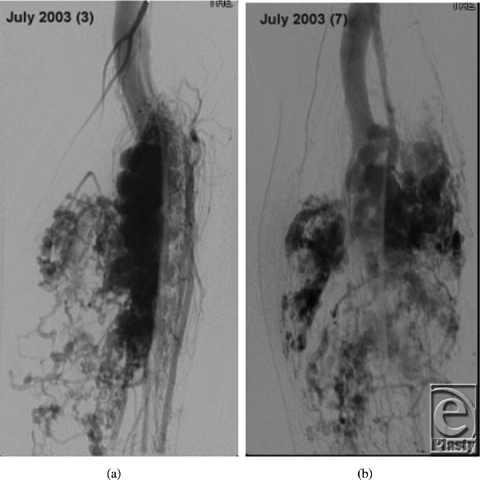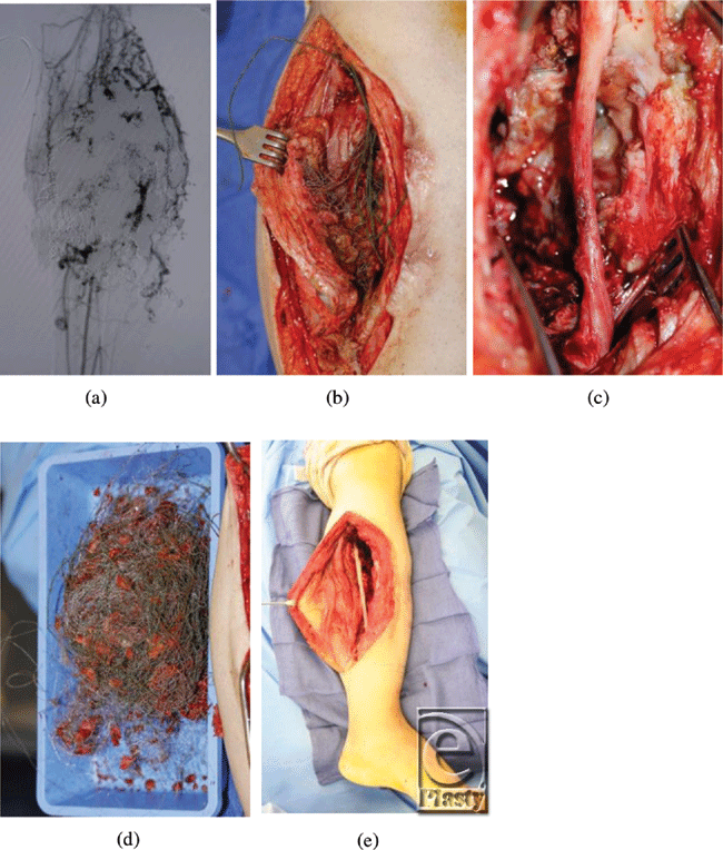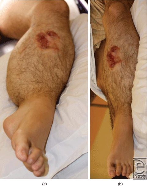 Our patient is a 19-year-old man diagnosed with an arteriovenous malformation of the left lower leg before the age of 10 years from outside of the United States (Figs 1a and 1b). This progressed throughout his childhood and he had become essentially nonambulatory. He was initially treated with local sclerotherapy and embolization in England, starting at the age of 11 years and continuing with 8 additional embolization procedures over the course of 2 years. The embolization procedures were ineffective, and he was subsequently treated with 27 separate interventional radiological coiling procedures in the United States, the latest being performed in early 2010. The patient unfortunately then developed significant tissue necrosis with numerous exposed coil and subsequent deep infection. Skin grafting was attempted but failed, leaving him with a chronic abscess, significant limb edema, pain, foot drop, and severe restriction in his ambulation and activities of daily living (Fig 2). Multiple centers had recommended amputation of the limb.