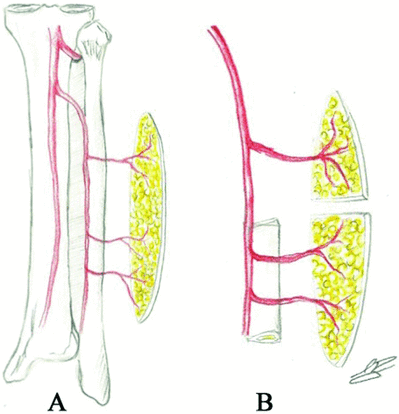 All of these reconstructive options create 2 skin paddles capable of independent rotation while avoiding the disadvantage of additional anastomoses required of 2 separate free flaps and the comorbidities related to a second donor site. The reconstructive technique described by Daya6 offers the possibility of a very large proximal skin paddle and the long pedicle of this skin paddle offers a high degree of independent movement. Daya6 also asserts that a flap based on musculocutaneous perforators is easier to raise than flaps based on septocutaneous perforators because of their close adherence to the periosteum. During our case, we found a subperiosteal dissection to be a reliable way of raising and preserving the septocutaneous perforators.