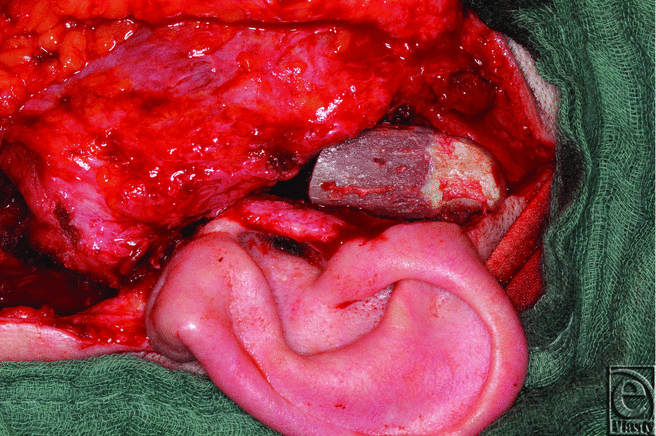 Starting the operation, the occlusion was fixed with wire splints. In the next step, the costochondral graft was harvested without any complication from the right ninth rib and kept in a moist bandage during excision of the neoplasm. Through a submandibular and a preauricular approach, the tumor and the condylar process were totally resected. The margins of all frozen sections were clear. The harvested autologous costochondral rib graft was prepared and shaped before transplantation (Fig 1). Osteosynthesis of the cleaned, shaped, and adjusted rib graft to the mandibular ramus was ensured with 2 mini plates (Fig 2). The chondral part of the rib graft was placed facing the articular fossa of the temporal bone, forming a new condyle that ensured articular functions. The cryoconserved and moist allogeneic amniotic membrane was mounted onto the condylar part of the new joint head. Thereby, the epithelial side of the membrane was adjusted toward the joint cavity (Fig 3). Before closing the operation site, the patient's occlusion was reevaluated and adjusted. Intraoperatively, no surgical complications were noticed and also the anesthesia was well tolerated by the patient.