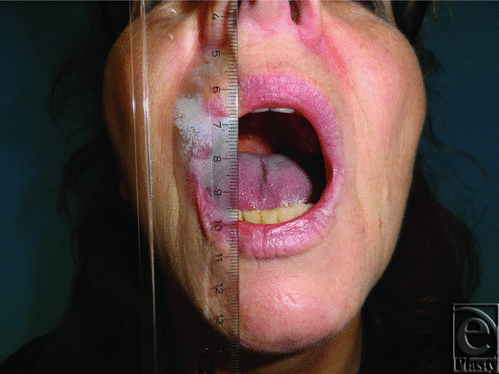 The postoperative treatment included intensive physiotherapy and regular follow-up appointments. Wound healing, mouth opening, and her general condition were evaluated on the 1st, 3rd, 5th, 7th, 14th, and 30th day and then every month postoperatively. A 20-month follow-up of the patient showed uneventful wound healing without complication. Ankylosis of the TMJ was avoided by long-term observation and the patient presented a maximum interincisal opening of 32 mm 8 months postoperatively (Fig 4). The correction of the ankylosis has to be considered as the consequence of an optimal interplay of the resection of the tumor, the successful reconstruction, aggressive physiotherapy, and good compliance by the patient.