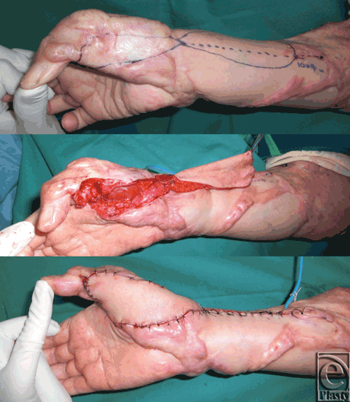 The current treatment strategy of severe keloids requires that if scar contractures are present, contractures should be released surgically.7 An important local factor that appears to promote keloid development and progression is the presence of strong stretched tension around the scar. For this reason, it is important to use flaps for severe keloid-associated contractures.8,9 In the present case, the flap was harvested from the ipsilateral forearm and then both the flap donor and recipient sites were irradiated. This surgical technique appears to prevent the development of large scars and is particularly effective when combined with postoperative radiation therapy.