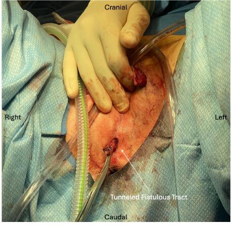 The patient was a 62-year-old man with a past medical history of Fournier gangrene of unknown etiology, status post-debridement and reconstruction of the scrotum using bilateral pudendal artery perforator flaps in September 2022. Within the immediate postoperative period, the patient developed chronic sinus tracts and, 8 months later, received an excision of a blind-ended sinus tract to the left scrotal reconstruction. He also had a persistent sinus tract at the base of the phallus that developed 1 year post-reconstruction, which was managed initially with dressings. Given concern for urethral involvement, a retrograde urethrogram was performed, which did not show any connection to the urethra. However, after failure to resolve, the patient presented in June 2024 for sinus tract exploration by plastic surgery and urology.