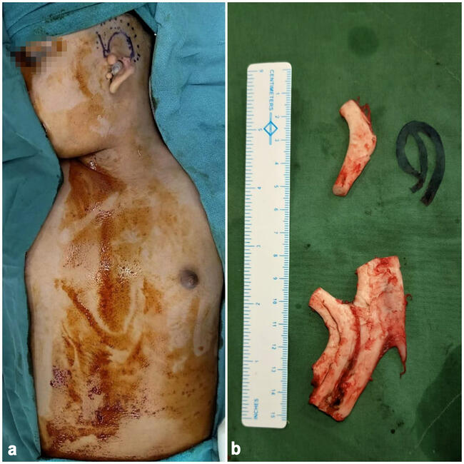 The patient was induced with general anesthesia. After induction, markings were made for the position of the neo-auricle over the auricle remnant. An access incision was made in front of the root of the helix, and a subcutaneous pocket was created 1 cm beyond the marked margin of the cartilage framework. Cartilage was harvested from the left sixth through eighth synchondrosis joints with subperichondrial dissection to construct the framework. A cavity inspection was performed to check for pleural tears. The basal block, helical rim, and antihelical rim were chiseled out and fixed with 4-0 nonabsorbable polypropylene monofilament sutures. A piece of cartilage was banked in the temporal region for future framework elevation. The remnant cartilage was diced and filled into the subperichondrial pocket. The wound was closed in layers following insertion of a 12-French suction drain in the ear pocket and 16-French in the chest donor cavity. Contour dressing was done over the ear framework.